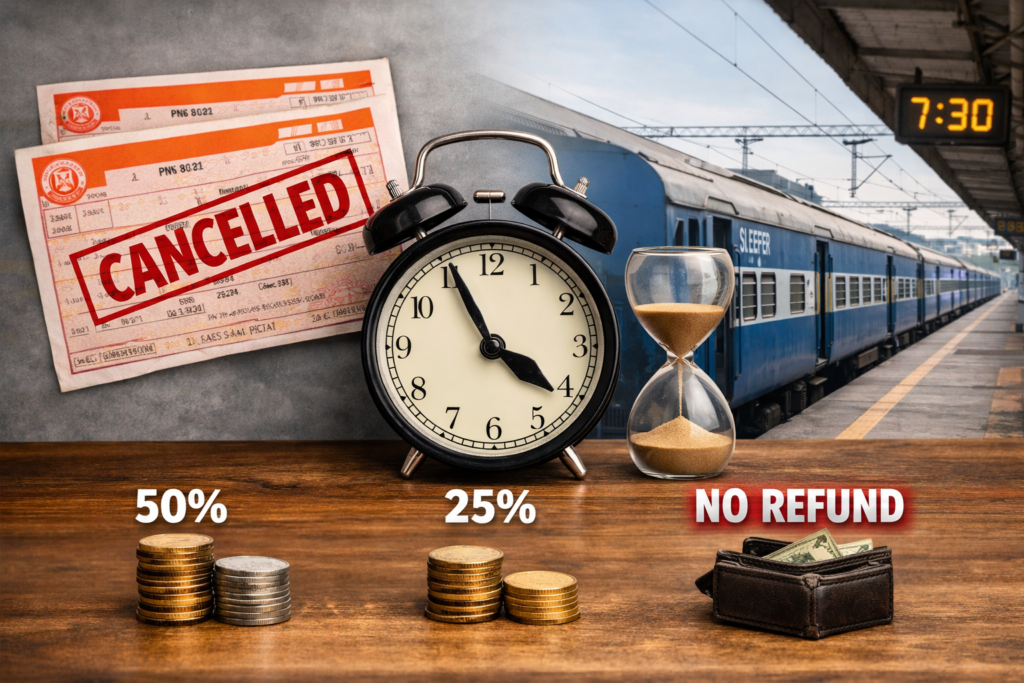 இந்திய ரயில்வே வரும் ஏப்.1 முதல் பயண விதிமுறைகளில் முக்கிய மாற்றங்களை மேற்கொள்ள உள்ளது. இதன்படி, உறுதி செய்யப்பட்ட ரயில் டிக்கெட்டுகளை ரயில் புறப்படுவதற்கு 8 மணி நேரத்திற்கு முன்னதாகவே ரத்து செய்யாவிடில் ரீஃபண்ட் கிடைக்காது.