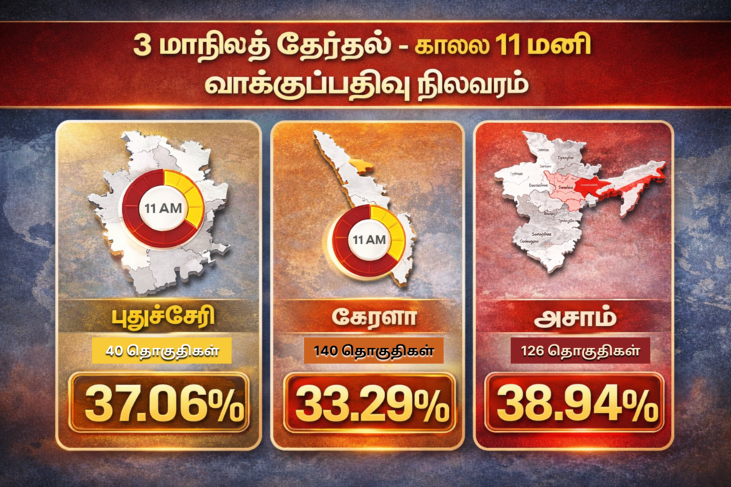 அந்த நிலவரப்படி கேரளத்தில் 33.29% புதுச்சேரியில் 37.06% அசாமில் 38.94% வாக்குகள் பதிவாகியுள்ளன. 3 மாநிலங்களில் காலை 7 மணிக்கு தொடங்கிய வாக்குப்பதிவு விறுவிறுப்பாக நடைபெற்று வருகிறது.