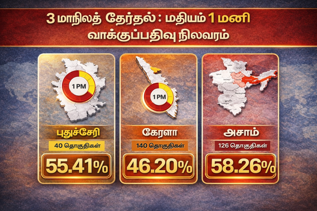 இந்நிலையில், தற்போது மதியம் 1 மணிக்கு வெளியான இம்மாநிலங்களின் வாக்குப்பதிவு நிலவரப்படி, கேரளத்தில் 46.20% புதுச்சேரியில் 55.41% அசாமில் 58.26% வாக்குகள் பதிவாகியுள்ளன.