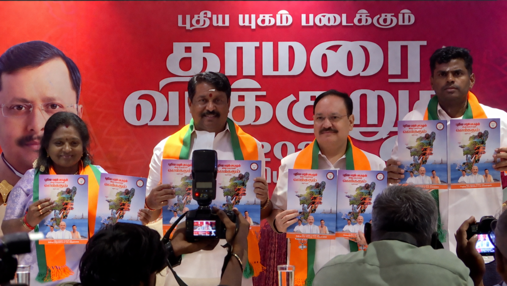 இந்நிலையில், பாஜக முன்னாள் தேசியத் தலைவரும் தற்போதைய மத்திய அமைச்சருமான ஜெ.பி. நட்டா தமிழக சட்டப்பேரவைத் தேர்தலுக்கான பாஜக தேர்தல் அறிக்கையை வெளியிட்டுள்ளார்.